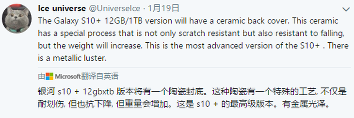 除此之外,冰宇宙也曾透露Galaxy S10+陶瓷版本还将配备12GB RAM+1TB ROM的超大内存组合,且陶瓷材质是三星采用特殊的工艺制造,不仅更具防刮性和防摔性,同时还将具有“金属光泽”。