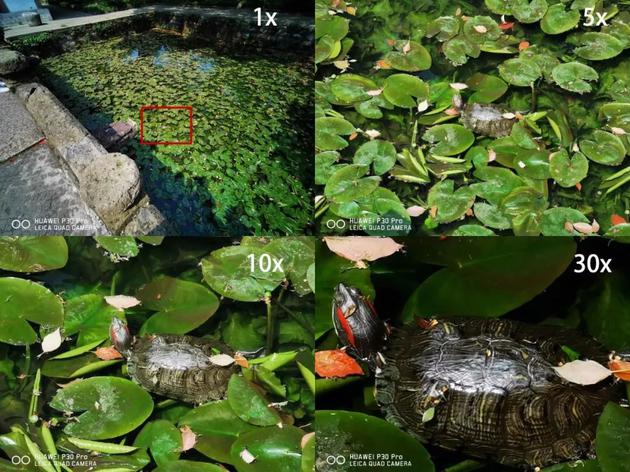 当然,华为 P30 Pro也能提供高达30x和50x的数码变焦,但我觉得从摄影角度来看其实用性一般,所以通常只把变焦范围控制在10x混合变焦以内。这里还有一组我在锡惠公园的某莲花池内拍摄到的乌龟场景:在1x时很难找到乌龟所在,但5x光学变焦就能清晰看到目标而10x混合变焦的体验最佳。
