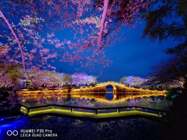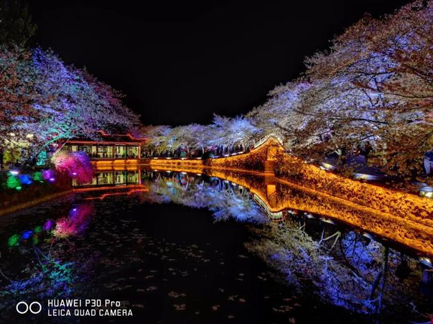 由于鼋头渚的樱花已经飘落大半,枝头上也已经绿意盎然,因此我特地选择在入夜后拍摄鼋头渚“太湖佳绝处”的夜樱美景。此时,华为 P30 Pro超强的夜景拍摄能力就被充分展现出来了。