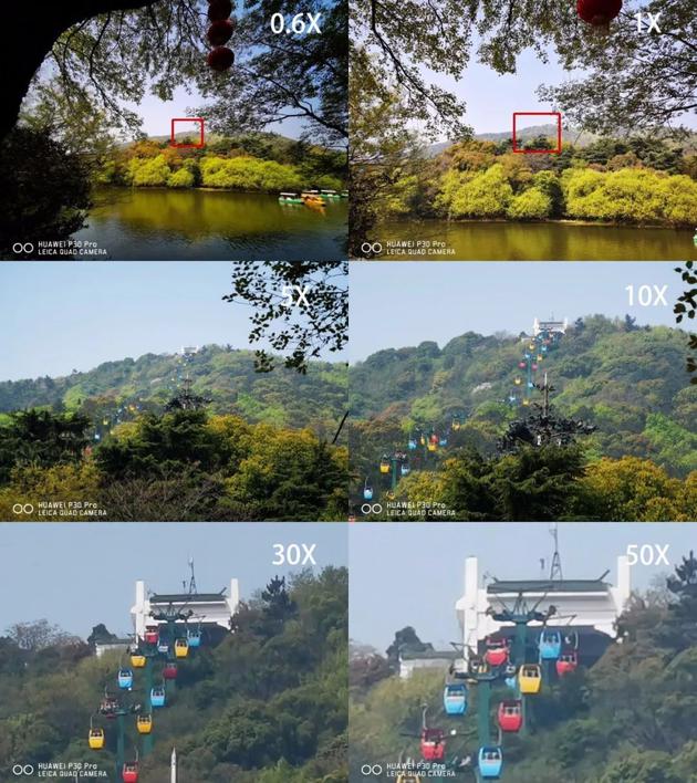 首先请看这一组变焦对比图,分别采用0.6x的超广角(等效约16mm镜头)、1x主摄像头、5x潜望式光学变焦、10x混合式望远以及30x和50x数码变焦效果进行对比。拍摄目标是山顶的缆车站——当然,在超广角与1x时它在画面中所占比重极小,几乎难以辨认。但在800万大像素的潜望式长焦摄像头作用下,它的形象变得清晰起来。