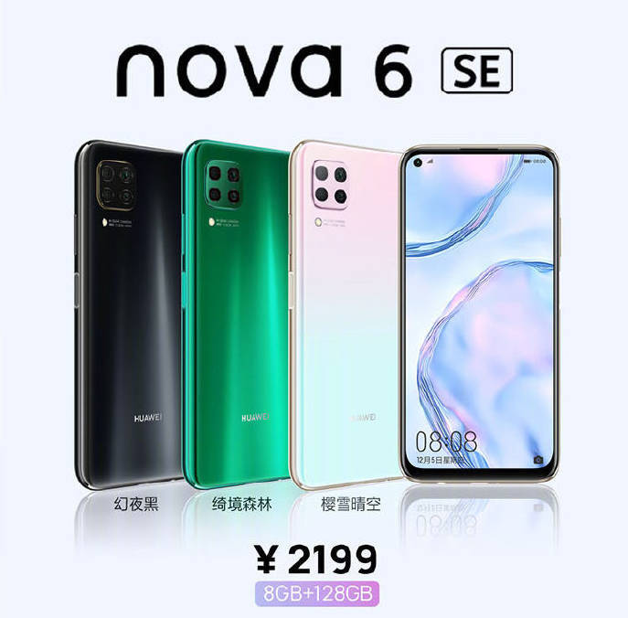 华为nova 6 SE采用了6.4英寸极点全面屏,分辨率为2310×1080,手机尺寸为159.2mm×76.3mm×8.7mm,重量为183g,搭载7nm工艺旗舰级工艺麒麟810处理器,自研达芬奇架构NPU加持,CPU单核性能提升80%,GPU性能提升162%,该机采用了潮流的设计,简约高雅,8GB内存,128GB或256GB内置存储,四摄为矩阵布局,分别为4800万主摄+200万景深+200万微距+800万广角,前置1600万自拍摄像头,支持人像超级夜景2.0,机身设计雅致,四曲面机身,侧边指纹识别,4200毫安电池,40W快充,30分钟可充至70%,通过德国莱茵T V权威安全认证。