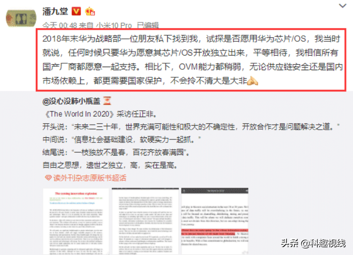 然而就在最近,华为和小米双方都给出了回答,小米高管潘九堂更是在个人微博上对此事进行了回复,潘九堂表示,早在2018年,华为战略部的一位朋友就曾私下试探小米有没有意向和华为合作,当时自己就给予了答复,只要华为能够将芯片和操作系统独立开放出来,公平对待,我相信国内没有一家国产手机厂商不会不愿意支持华为的
