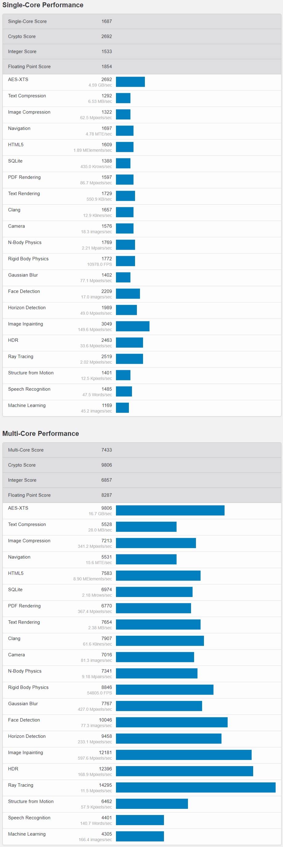 IT之家了解到,Geekbench 跑分显示,搭载 M1 芯片、配备 8GB RAM 的MacBook Air 单核得分为 1687,多核得分为 7433。M1 芯片的基本频率则为 3.2GHz。
