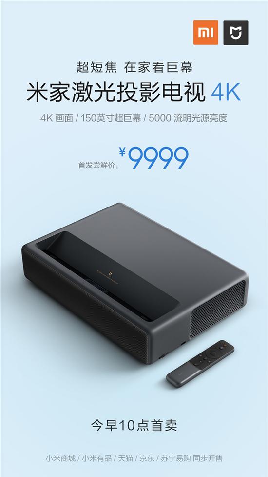 1月18日消息,小米商城官微宣布米家激光投影电视4K版今天上午10点正式发售,首发尝鲜价为9999元。