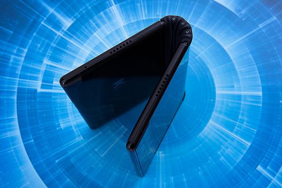 柔派的背部采用了全新的光学镀膜工艺,光可鉴人。深蓝色的机身采用了类似钢琴烤漆的工艺,搭配中部的仿皮革设计,质感还是不错的。为了实现屏幕的弯折,柔宇采用了外翻的设计,中间使用铰链结构连接。由于铰链外部包裹着类皮革材质,我们无法一探究竟。不过在使用中从皮革的褶皱推测,内部的铰链应该是可伸缩的设计,以配合正面屏幕的伸展。不仅如此,这样全包裹设计的铰链,还能够有效地防止灰尘进入,应该对使用寿命方面有所提升。