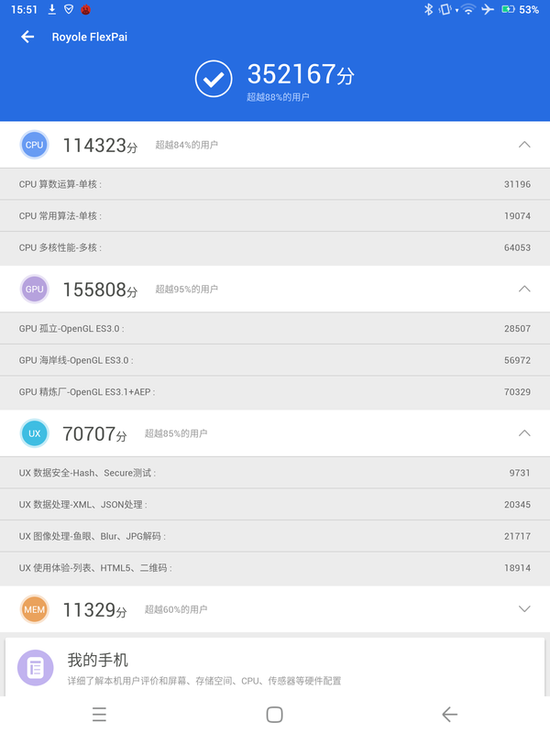 根据安兔兔的成绩显示,柔宇柔派得分为352167,CPU成绩为114323、GPUI成绩为115808、UX得分为70707、MEM得分为11329,是目前市面上的顶级水准。这样的成绩,可以说能够完美Handle市面上的各种大型3D游戏了。
